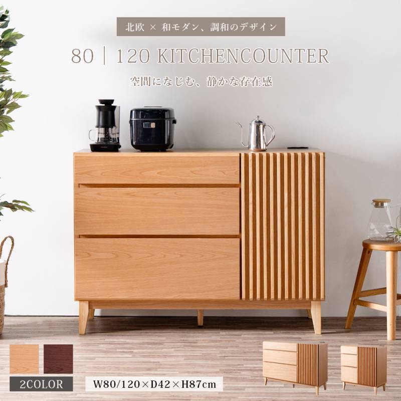 キッチンカウンター キッチン収納 食器棚 幅80cm/幅120cm ブラウン ナチュラル ルーバーデザイン お掃除ロボット対応 脚部お客様取り付け