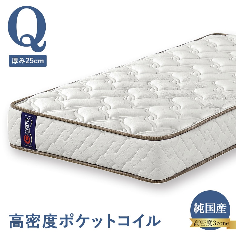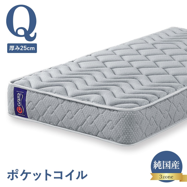 ポケットコイルマットレス クイーンサイズ(マット2つで1セット) 並行配列 高密度ポケットコイル 3ゾーン構造 25cm厚 エッジサポート ナノポケット 日本製 グランツ Granz Q 受注生産