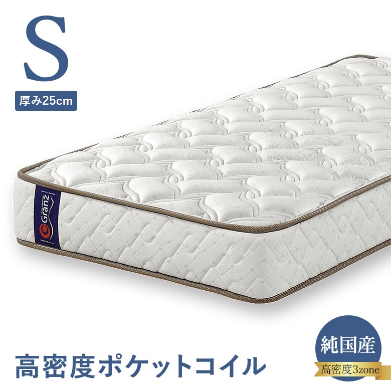 ポケットコイルマットレス シングルサイズ 高密度ポケットコイル 3ゾーン構造 並行配列 25cm厚 エッジサポート ナノポケット 日本製 グランツ Granz Sサイズ