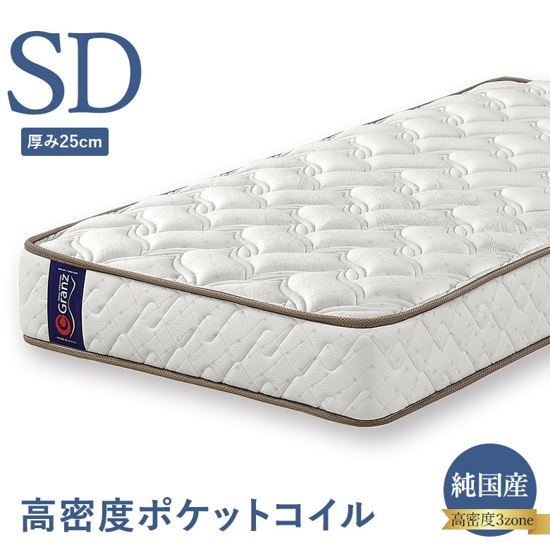 ポケットコイルマットレス セミダブルサイズ 高密度ポケットコイル 3ゾーン構造 並行配列 25cm厚 エッジサポート ナノポケット 日本製 グランツ Granz SD