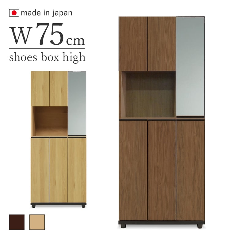 75シューズボックス ハイタイプ ミラー付き 下駄箱 靴箱 玄関収納 幅75cm ナチュラル ブラウン 背面消臭シート付き 完成品 日本製