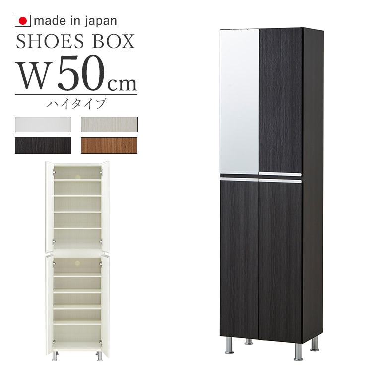 50シューズボックス ハイタイプ 下駄箱 シューズボックス 幅50cm 鏡付き 強化紙 ツヤ有 ハイタイプ プラスチック棚 取っ手アルミ製 日本製