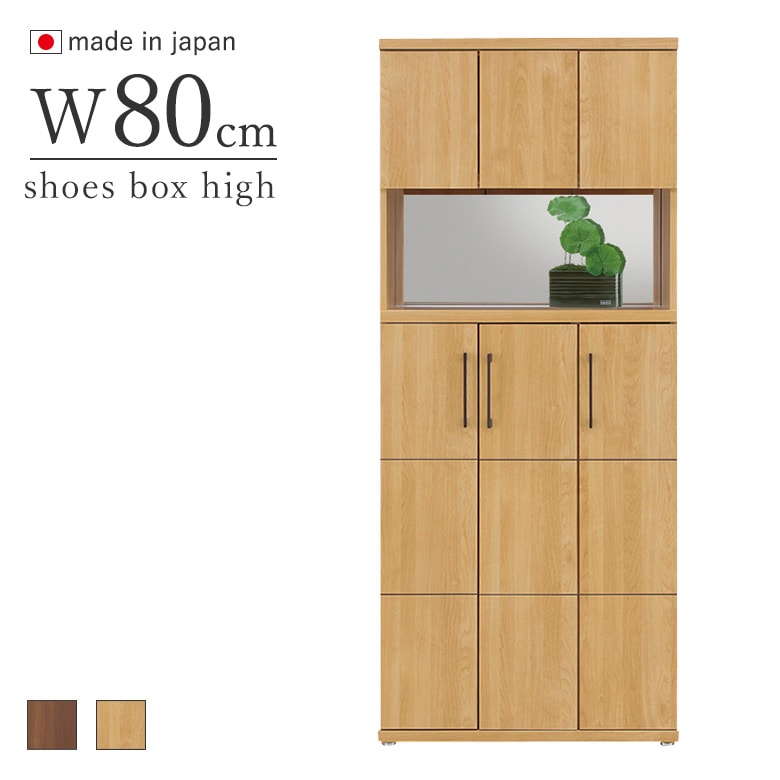 シューズボックス 80cm ハイタイプ オープンスペース背面鏡 24足収納 ブラウン・ナチュラル 完成品 日本製