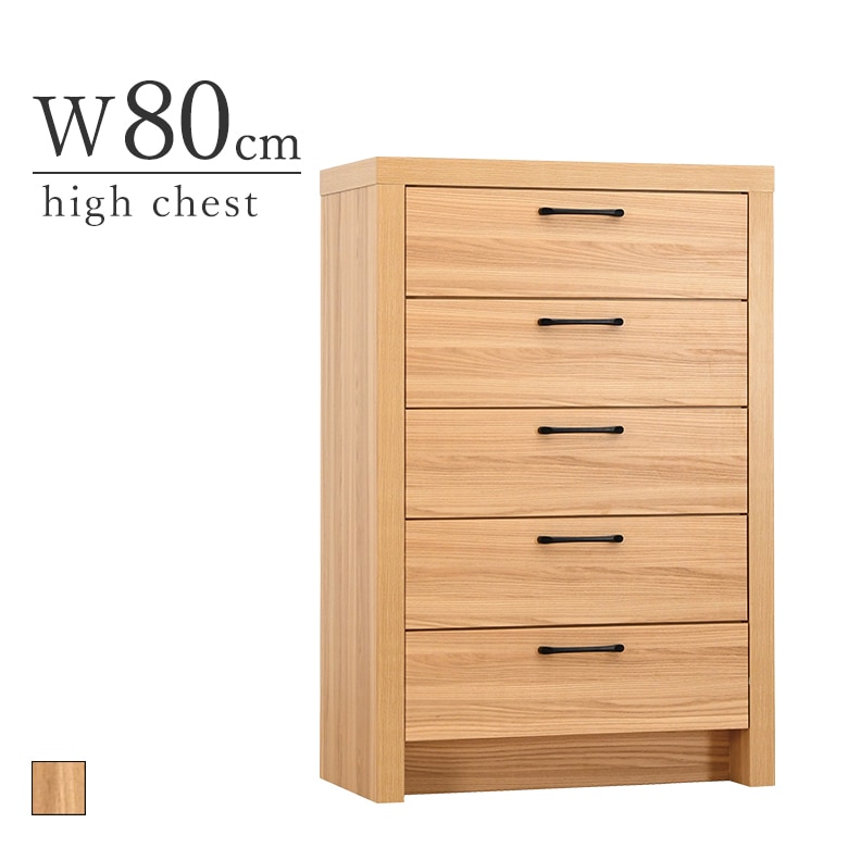 80-5チェスト 幅80cm ナチュラル オーク木目柄 完成品 フルスライドレール付き ハイチェスト