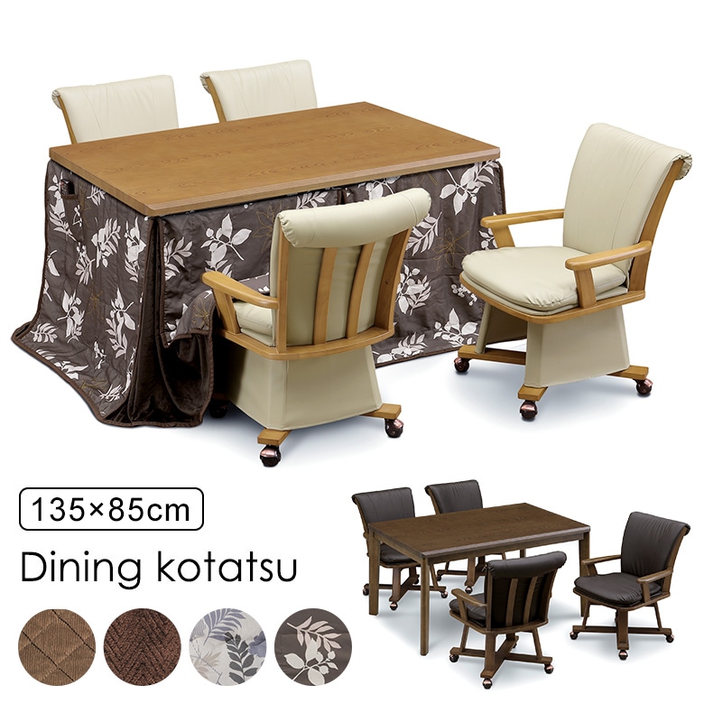 ダイニングこたつ 6点セット 幅135×85cm 回転チェア 肘付き キャスター付き 布団セット UV塗装 4人用 【ナチュラル色・ブラウン色】布団付き ハイタイプこたつ こたつテーブル