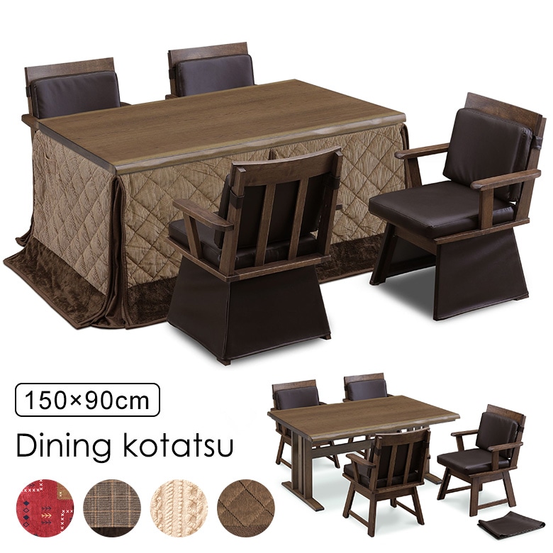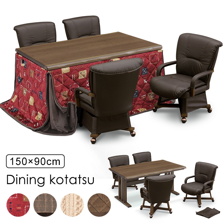ダイニングこたつテーブル 6点セット 150×90cm 布団セット ハイタイプ 4人用 回転椅子 肘付き キャスター付き ブラウン こたつテーブル オーク突板 UV塗装 和風 和室
