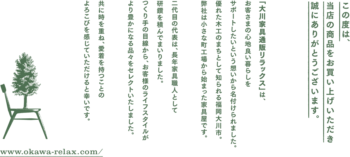 当店は、福岡県の南西部に位置する日本一の家具のまち、大川市に所在します。