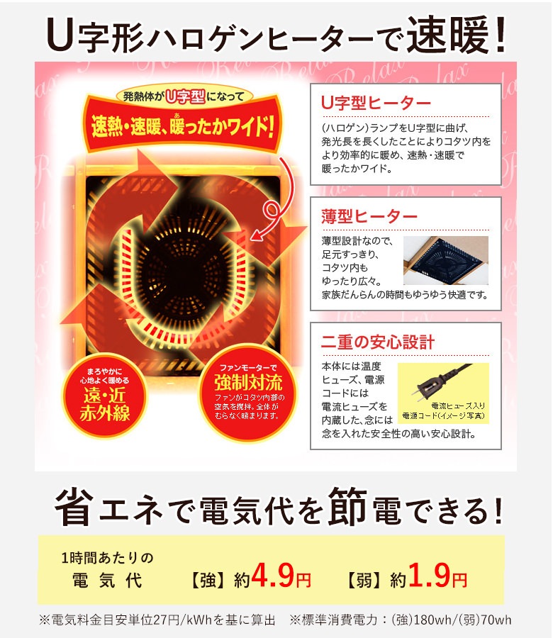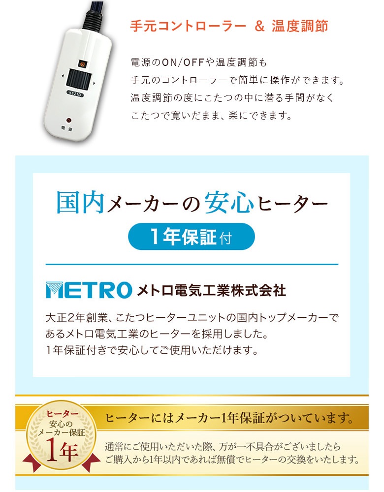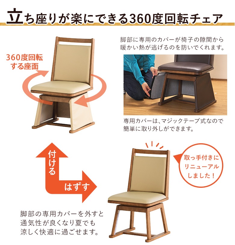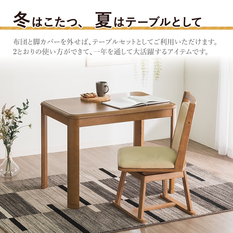 ※お客様組立て ・天板UV塗装仕上げ ・600W手元コントロールハロゲンヒーター付き ・チェアーは座面回転 ・チェアー下部のカバーは取り外し可能 ・テーブル継脚(3cmUP) 【生産国】 テーブル:インドネシア/チェアー:インドネシア/布団:中国 |