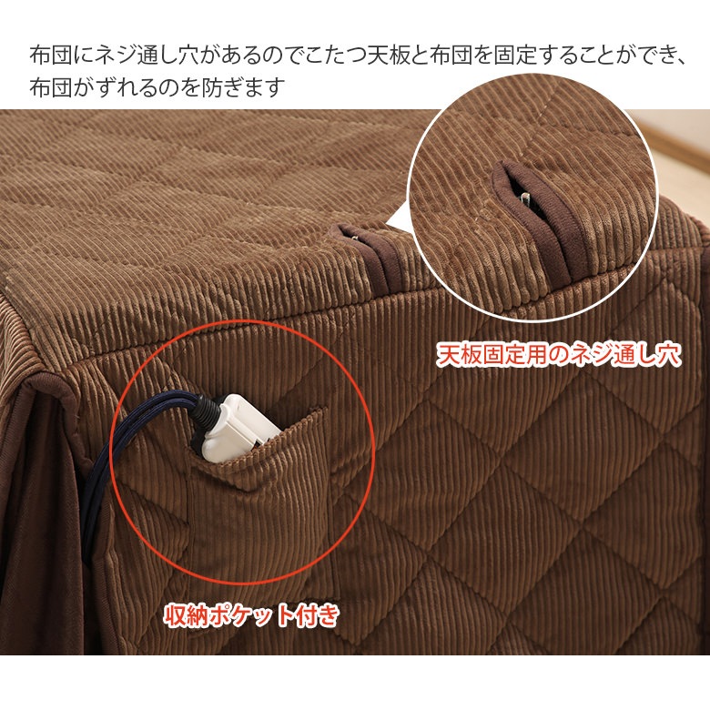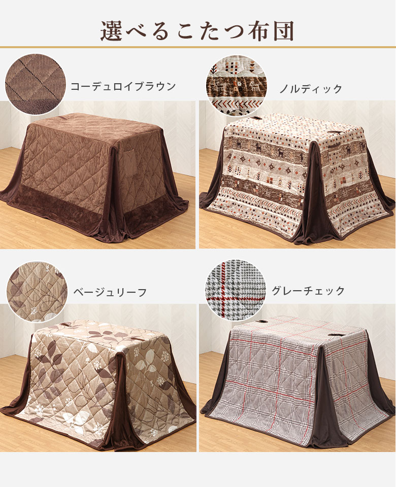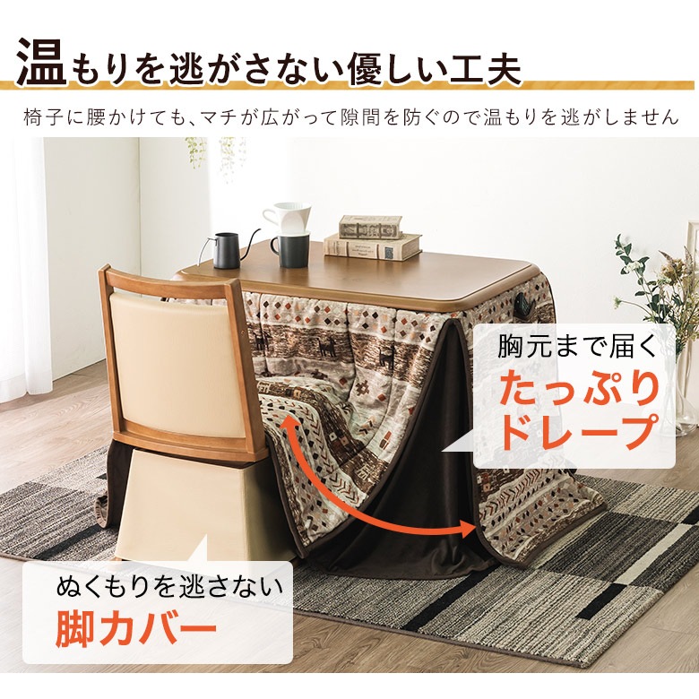 コタツ:栓柄転写仕上げ(UV塗装) チェアー:ラバーウッド・合成皮革 布団表面:ポリエステル100% 布団裏面:ポリエステルボア 中綿:ポリエステル100% |