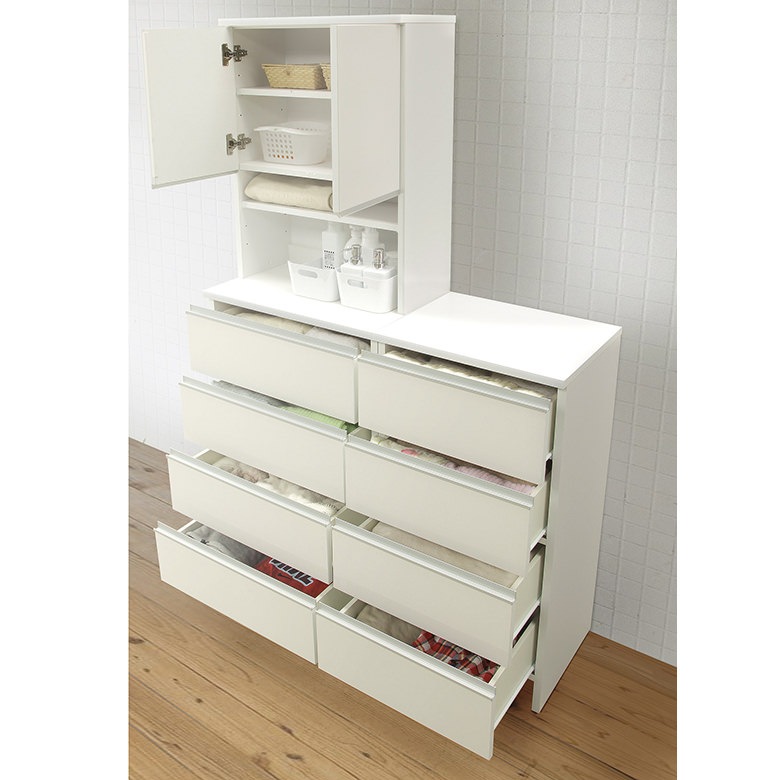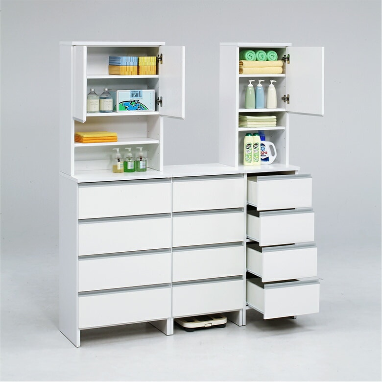 ※お客様組立て(上下台分割式、完成品) ・日本製 ・引き出しはローラーレール付き ・上下ジョイントはカムロック固定 ・可動棚2枚付(上扉内1枚、オープン部1枚) ・本体下側にヘルスメーター収納可能 |