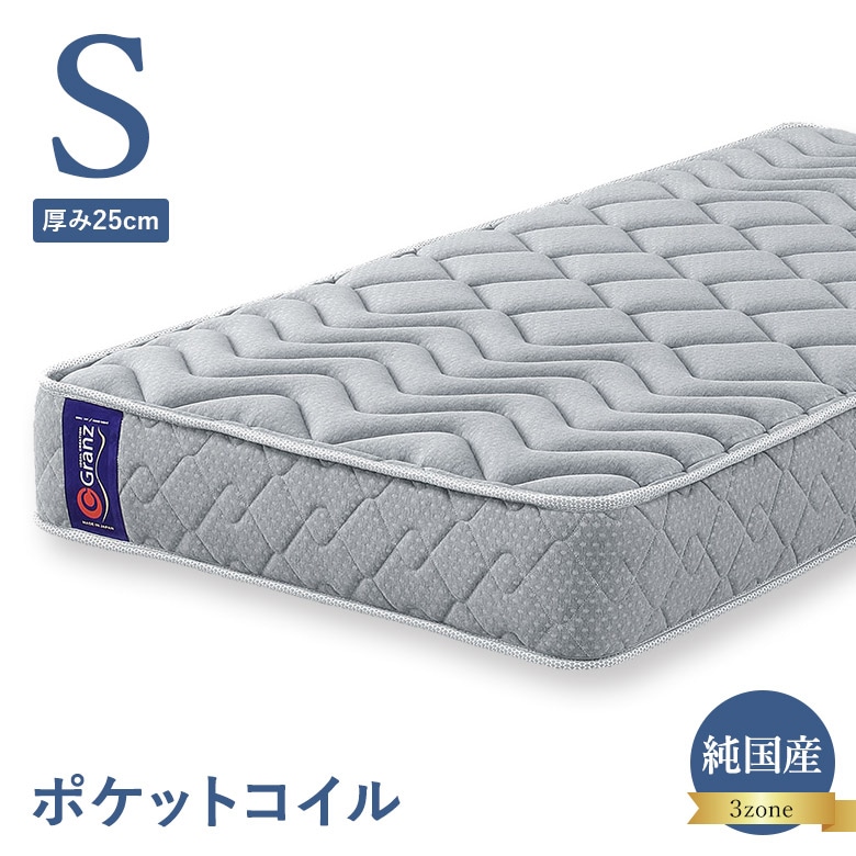 ポケットコイルマットレス シングルサイズ 3ゾーン構造 並行配列 25cm厚 エッジサポート 日本製 グランツ Granz シングルベッド用