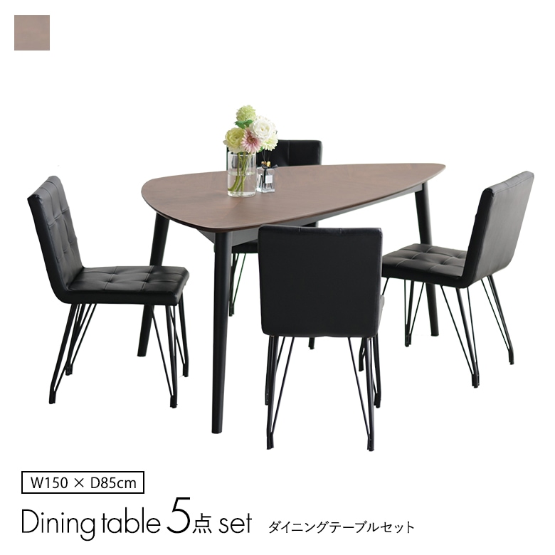150ダイニングテーブル5点セット 幅150cm 変形テーブル 木の葉型テーブル ウォールナット ブラウン チェアブラック 4人用
