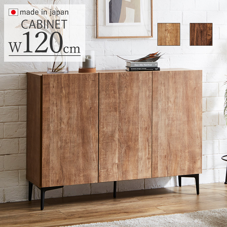 120キャビネット リビング収納 テレビ台 強化紙 ブラウン ナチュラル スチール製のブラック脚 日本製 【扉は静かに閉まるソフトクローズ仕様】