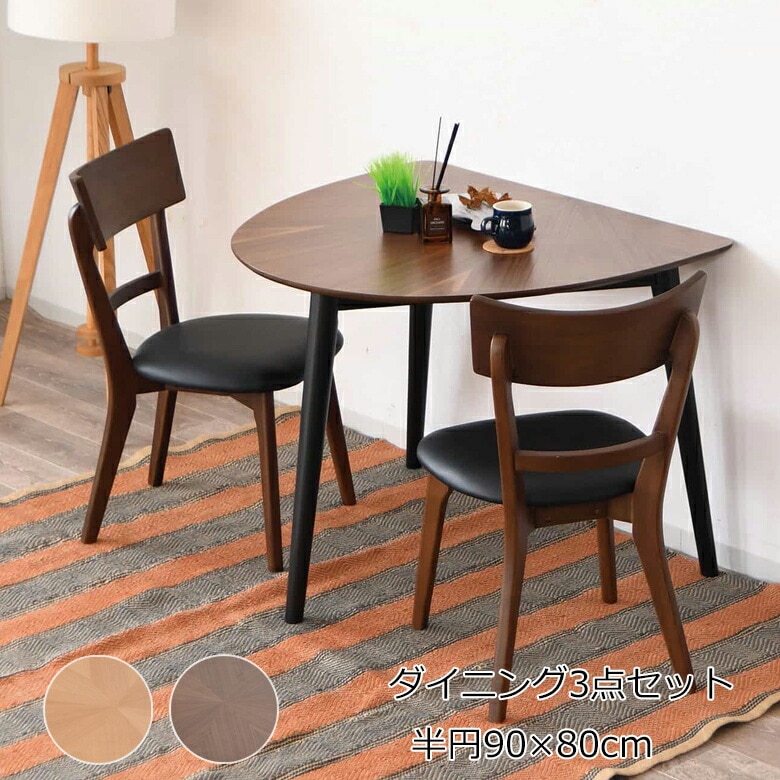 ダイニング3点セット 90半円 テーブルセット 幅90×80 ダイニングセット 2人掛け 省スペース リビングテーブル オーク突板 ウォールナット突板 カフェ 半丸型 ナチュラル ブラウン