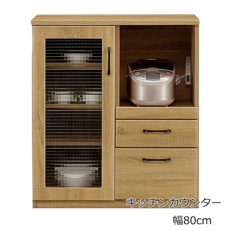 80カウンター キッチン収納 木目調 強化紙 コンセント付き 引き出しフルオープンレール付き キッチンカウンター 炊飯器収納 レンジ台 完成品