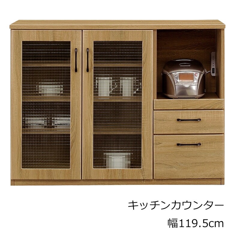 120キッチンカウンター 幅120cm キッチン収納 木目調 強化紙 コンセント付き 引き出しフルオープンレール付き 炊飯器収納 レンジ台 カウンター 完成品