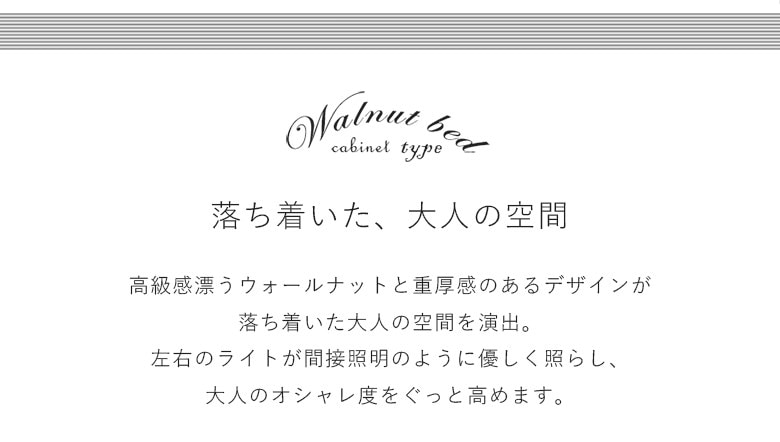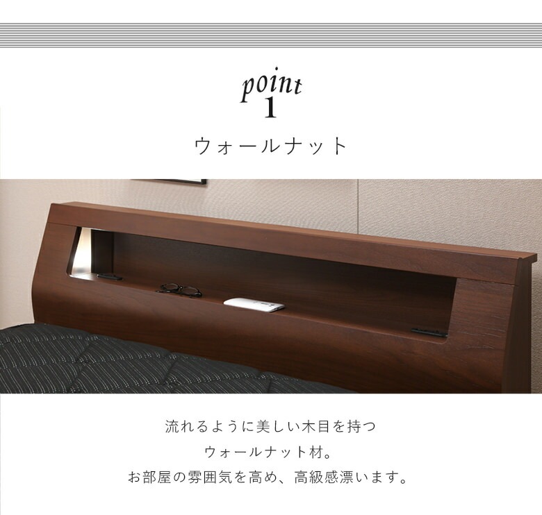 ※お客様組立て ・マットレス別売り ・輸入品 ・床板:布張り ・ウォールナット(流れるような美しい木目をもつウォールナット材がインテリアの雰囲気を高めます) ・オーク(やさしい色合いのオーク材が心地よい空間を作り出します) ・棚付き(上段奥行:7cm、下段奥行12cm) ・コンセント付き(携帯電話などの充電に便利です) ・LEDライト付き(球タイプのLED照明なのでやさしく部屋を照らします) |