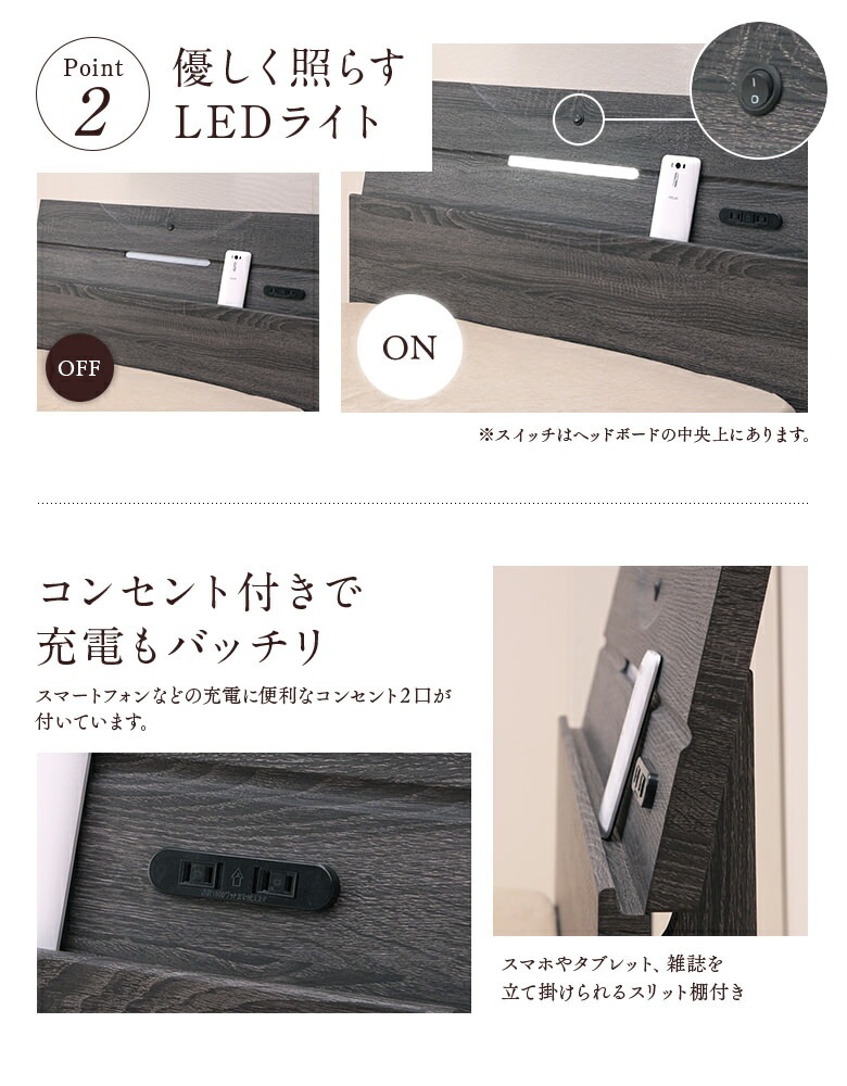 ※お客様組立て ・マットレス別売り ・輸入品 ・床板:すのこタイプ ・LEDライト、2口コンセント付き ・ヘッドボード裏面化粧仕上げ ・スマホ、タブレット、雑誌等を立てかけられる棚付き |