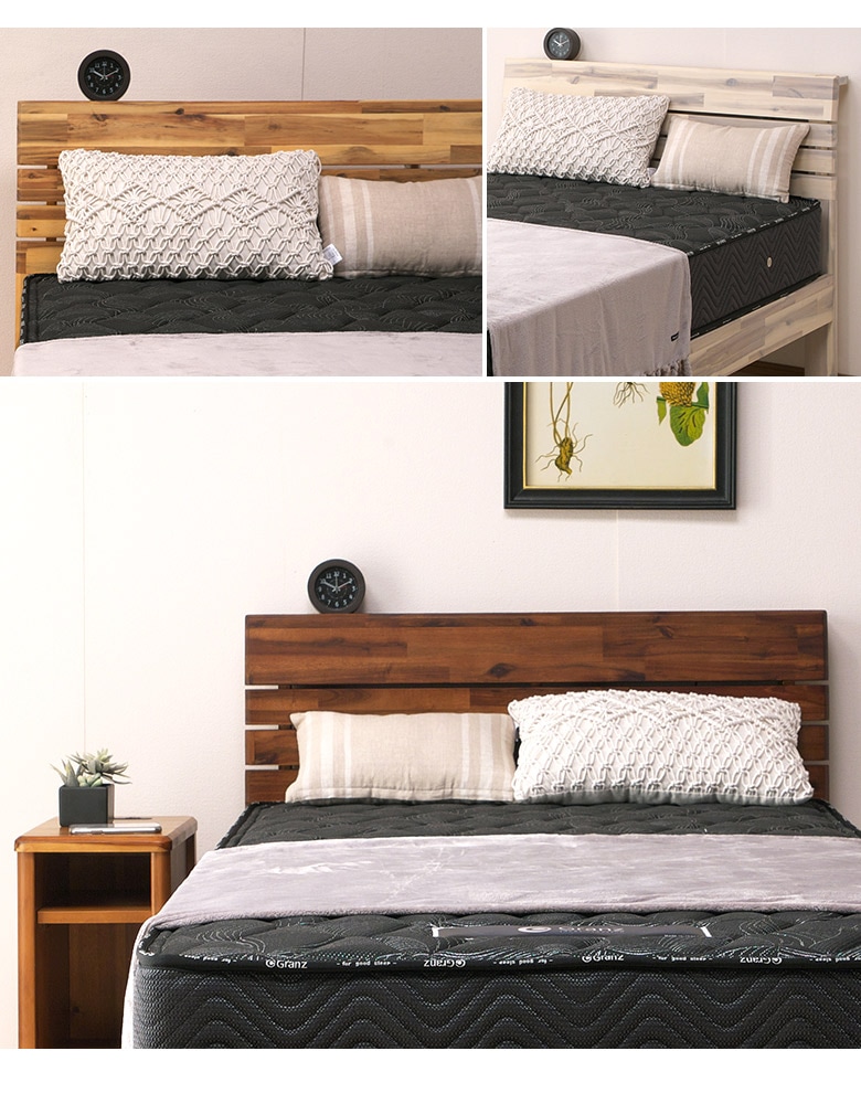 アカシア天然木 すのこベッドフレーム シングル/セミダブル/ダブル ナチュラル/ブラウン/ホワイト 棚付き 2口コンセント お掃除ロボット対応 木製 スノコベット