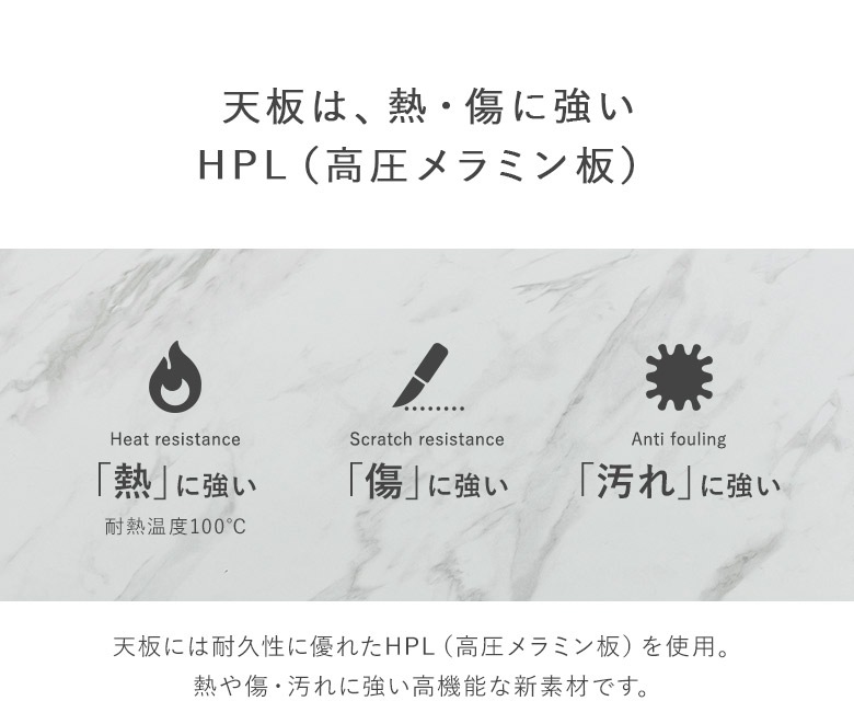 天板:HPL(高圧メラミン板) テーブル脚/幕板:ラッカー塗装 チェア:ラバーウッド/PVC